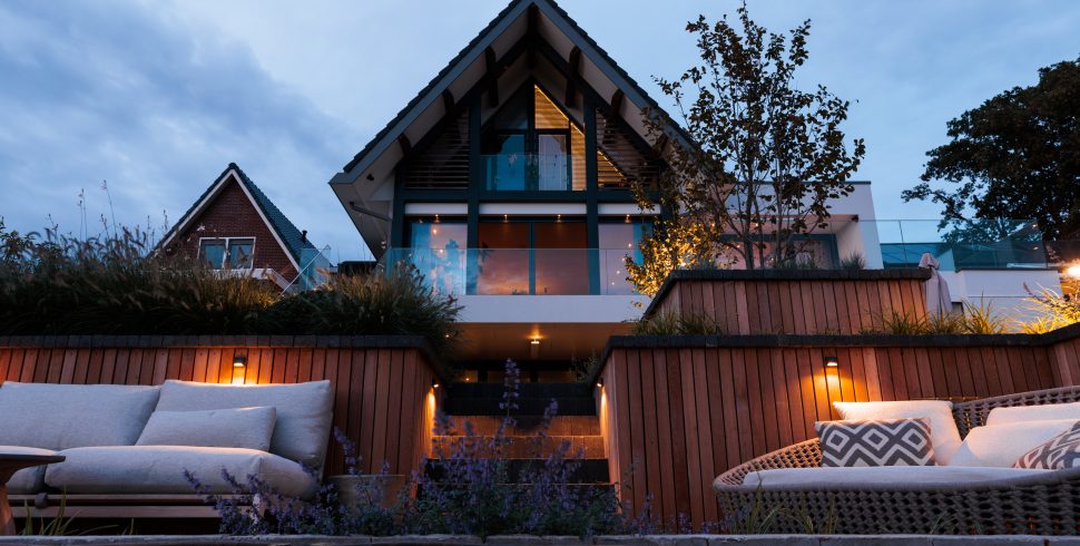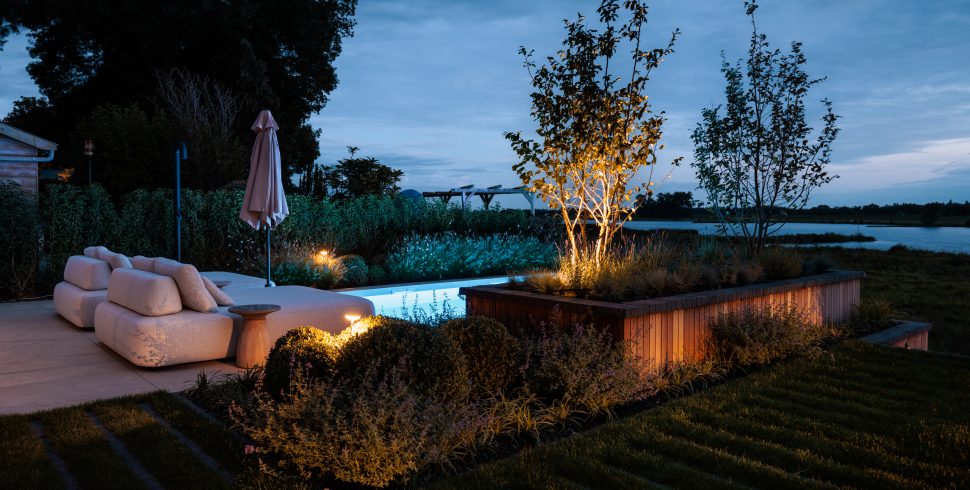 Zodra de zon ondergaat, krijgt de tuin een tweede leven. De beplanting wordt subtiel uitgelicht, accenten vallen extra op en de tuin nodigt uit om heerlijk te ontspannen.