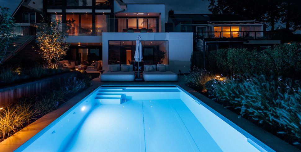 • Een lang zwembad verlengt het zicht en biedt rust in de compositie